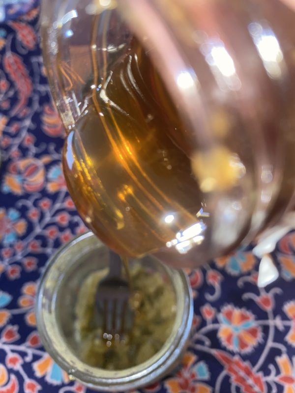 - Next pour in your almost boiling water which should be equal parts to your paste (we did about 2 oz) now stir until mixed.